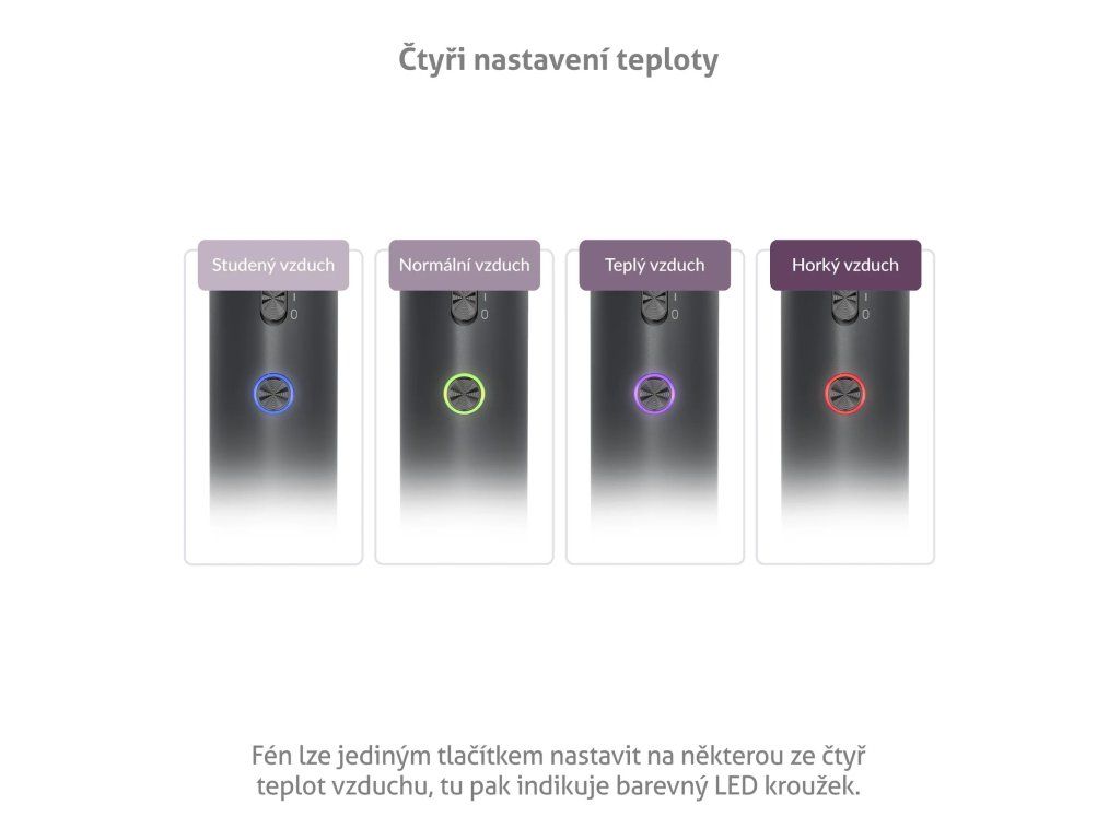 Tlačítko fénu je opatřeno barevným LED kroužkem, který ukazuje aktuálně nastavenou teplotu. Studený vzduch značí modrá barva, normální vzduch zelená barva, teplý vzduch má barvu fialovou a horký vzduch červenou.
