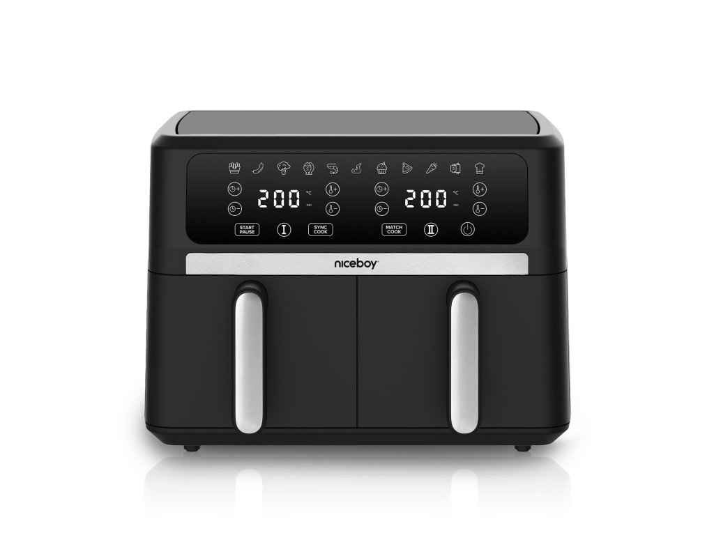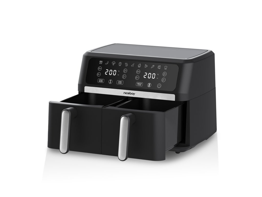 S horkovzdušnou fritézou Niceboy AirFryer DUO připravíš hlavní chod i přílohu najednou. Má totiž ne jeden, ale hned dva oddělené koše – každý o objemu 4,5 litru. Peč, griluj, smaž nebo jenom ohřívej. Ve 2,4kilowattové fritéze horký vzduch cirkuluje, takže oběd, snídani nebo večeři připravíš vždycky rovnoměrně. A navíc s minimem tuku! Rychlé a nutričně vyvážené jídlo už nebude jenom tvoje zbožné přání.