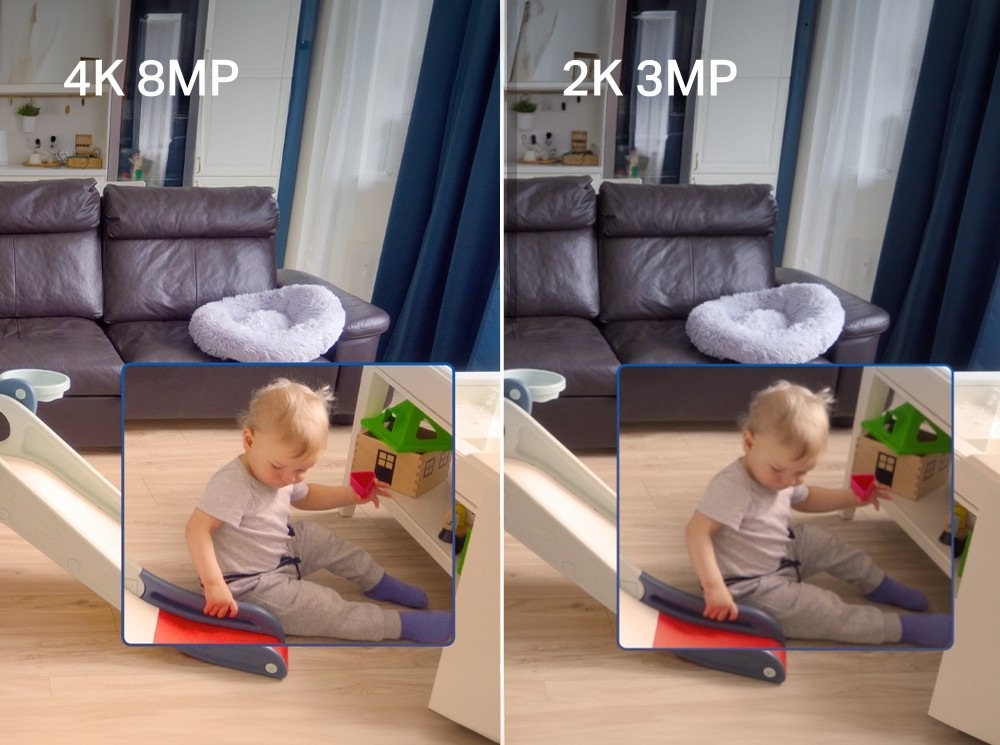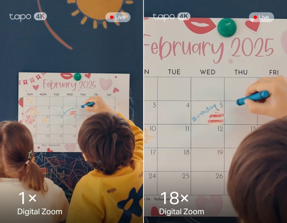 S rozlišením 4K dokáže kamera zachytit i drobné detaily, které by jinak zůstaly skryté. Digitální 18násobný zoom navíc umožní přiblížení záznamu bez výrazné ztráty kvality.