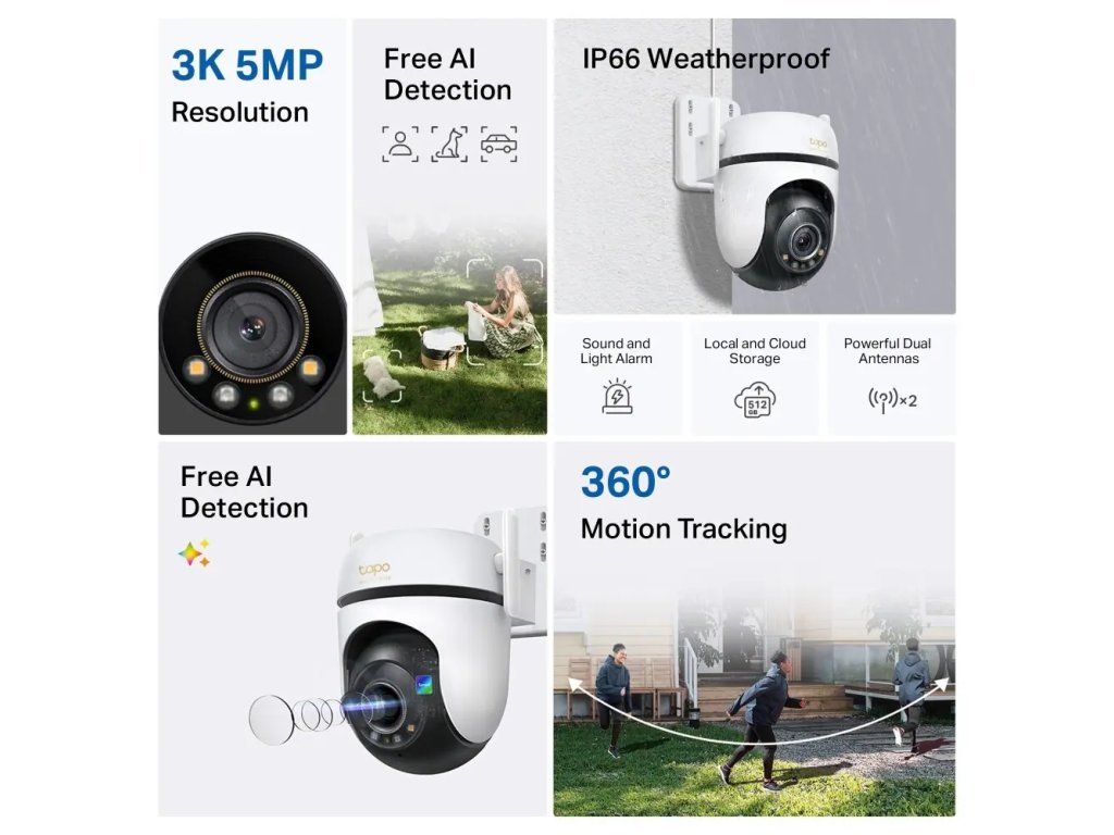 TP‑Link Tapo C530WS nabízí venkovní dohled v 3K rozlišení (2880×1620) a barevné noční vidění díky starlight senzoru a vestavěným reflektorům. Motorické PTZ zajišťuje 360° horizontálně s automatickým sledováním a režimem patroly. Inteligentní AI detekuje osoby, vozidla i mazlíčky, podporuje zóny a hlídání překročení linie. Připojíte ji přes Wi‑Fi (včetně Wi‑Fi 6) nebo Ethernet, nahráváte lokálně na microSD do 512 GB nebo do Tapo Care cloudu, přenosy jsou chráněny 128‑bit AES/SSL/TLS.