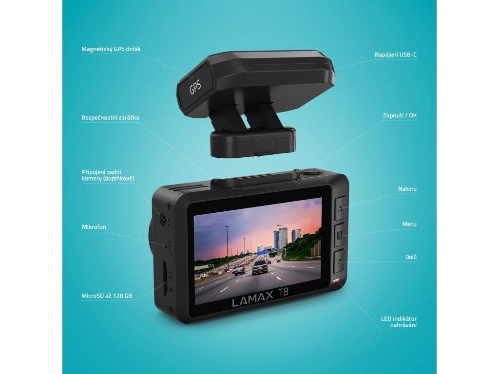 Kryje ti záda na cestáchJezdíš často, jezdíš rád, ale když vidíš tu dopravní džungli, potřebuješ trochu jistoty? Autokamera LAMAX T8s 2K rozlišením ti ji poskytne. Její 170° úhel záběru zachytí dění před autem a v jeho okolí, takže když se něco přihodí, máš na až 128GB microSD kartě jasný důkaz pro všechny úřady a orgány. Spolehlivá detekceradarů přispívá k bezpečnější jízdě, a navíc pokuty fakt nikdo nechce. Manipulaci s kamerou a její stabilitu zajišťuje magnetický GPS držák, na který kameru zacvakneš a na 2.4" displeji si jednoduše navolíš vše potřebné. České a přehledné menu celý proces usnadňuje. Kameru můžeš přes Wi-Fi propojit i s telefonem a apce pak záznamy spravovat. Pokud tě vždycky trápila životnost baterie, tak na ni zapomeň, tahle kamerka je vybavená superkondenzátorem, který zvládne i střídaní teplot, když pojedeš od moře za polární kruh. Nabíjení probíhá přes moderní USB-C. Zachyť každý okamžik NA MAX.