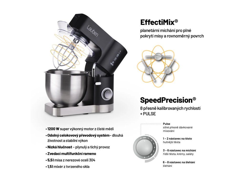 Váš kuchyňský superhrdinaLauben Kitchen Machine 1200BC je kuchyňský robot s bohatým příslušenstvím, díky kterému se za vás hravě postará o spoustu kuchyňských prací a zároveň vám ušetří místo v kuchyni. Ostudu vám v kuchyni neudělá ani vzhledem, což dokládá prestižní designové ocenění IF Design Award 2019. Míchání, šlehání, hnětení těsta i mletí masa, o to vše se spolehlivě postará spolehlivý měděný motor o výkonu 1200W a vysokozátěžové celokovové převody. Robot disponuje technologií EffectiMix® , která zajišťuje planetární mixovací pohyb a rovnoměrný výsledek. Díky systému SpeedPrecision® máte na výběr z 8 přesně kalibrovaných rychlostí a možnosti PULSE pro přesné výsledky. Hlavní mixovací nádoba je vyrobena z nerezové oceli a má kapacitu 5l. Robot jsme doplnili o mixovací sklenici z tvrzeného skla s víkem pro přidávání ingrediencí. Můžete ho tak využít k přípravě studených či vlažných polévek nebo čerstvých smoothies. Bezpečnost je vždy na prvním místě, proto je Lauben Kitchen Machine opatřen pojistkou, která ho spustí jen, je-li správně uzavřen, protiskluzovými nožkami a pojistkou proti přehřátí. Správné usazení mísy bude hračka díky barevnému indikátoru. Robot vás potěší i snadným ovládáním pomocí jediného tlačítka, nízkou hlučností a dvěma barevnými provedeními. Protože moc dobře víme, že není jednoduché každý den vymýšlet, čím nakrmíte rodinu či sebe, přidali jsme do balení kuchařku s recepty pro inspiraci.