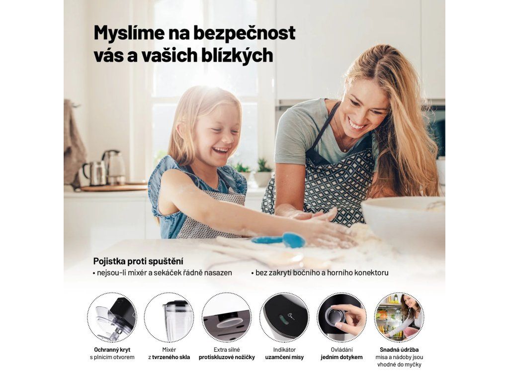 Bezpečnost by při vaření a přípravě potravin měla být vždy na prvním místě. Mysleli jsme na to i při vývoj tohoto kuchyňského robota. Díky pojistce se nikdy robot nespustí, není-li správně uzavřen. Disponuje i pojistkou proti přehřátí a extra silnými protiskluzovými nožkami, které se starají o to, aby robot zůstal na svém místě.