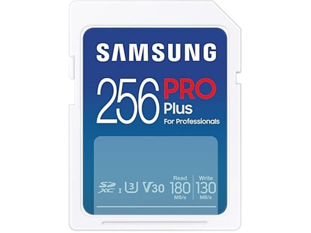 Paměťová karta Samsung 256 GB (SDXC) nabízí sekvenční čtení až 160 MB/s a zápis až 120 MB/s a nese klasifikace U3/V30/Class 10, takže zvládne plynulé natáčení 4K. Karta je víceúčelově odolná (vodě, nárazům, rentgenům, magnetům) a pracuje v teplotním rozsahu -25 až 85 °C; v balení je full‑size SD čtečka, adaptér není součástí.