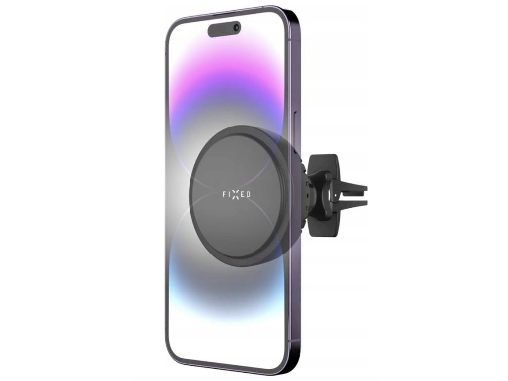 Držák FIXED MagCool s bezdrátovým nabíjením a aktivním chladícím systémem je unikátním řešením, které zabraňuje přehřátí uchyceného zařízení. Chlazení telefonu zajišťuje ventilátor v zadní části držáku spolu s Peltierovým článkem, který na straně pro uchycení telefonu teplo odebírá a odvádí ho pryč na druhé straně držáku. Telefon snadno přichytíte pouhým přiložením k hlavě držáku, kde se integrované MagSafe magnety spojí s kompatibilním telefonem řady iPhone 12 a výše a zabezpečí, že telefon bude stabilně uchycen po celou dobu jízdy. Stabilní uchycení je zaručeno i telefonům, které jsou opatřeny MagSafe krytem. Po přichycení okamžitě započne nabíjení, telefon se spolehlivě dobije s výkonem až 15 W (iOS max. 7,5 W). Vyvýšená plocha držáku je navržena tak, aby kopírovala MagSafe magnety v telefonu a nezasahovala do oblasti fotoaparátu, takže nehrozí jeho poškrábání či neúplné přilnutí. Držák se snadno instaluje do každé ventilace auta pomocí kleští se zpětným háčkem, který se zachytí za lamelu ventilace a brání vypadnutí držáku. Pro pohodlnou a bezpečnou jízdu lze snadno jednou rukou nastavit otočným kloubem držáku ten nejlepší pozorovací úhel. Mějte svůj telefon stále připraven k použití i v nejparnějších dnech, v blízkosti autotopení nebo při vysokém výkonu zařízení.