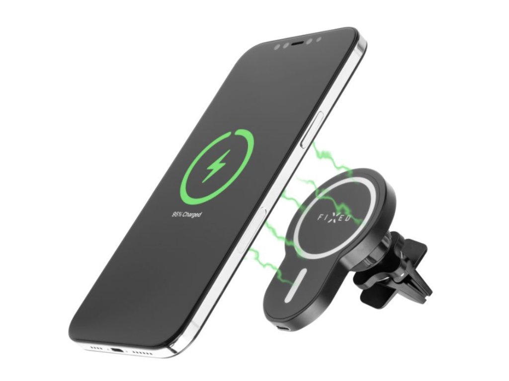 Držák FIXED MagClick vyvinutý přímo pro nejnovější Apple iPhone s funkcí MagSafe vám umožní mít telefon v autě pěkně na očích a zároveň ho pohodlně dobíjet během jízdy. Díky integrovaným magnetům stačí jen přiložit telefon k držáku a pomocí MagSafe se okamžitě sám zajistí. Drží bezpečně a bez problémů vydrží všechny otřesy způsobené jízdou. Pro rychlé nabíjení vašeho iPhonu je držák MagClick vybaven vysoce výkonnou cívkou s výkonem 7,5W a až 15W pro ostatní chytré telefony, dokáže tak doplnit energii v co nejkratším čase. Držák je určen pro uchycení pomocí pevných kleští do ventilační mřížky. Pomocí otočného kloubu si nastavíte telefon do ideálního úhlu tak, aby byl v případě potřeby pěkně na očích. Minimalistický a moderní design držáku nepřekáží na palubní desce a skvěle zapadne do interiéru vašeho vozu. S držákem FIXED MagClick bude vaše jízda s telefonem v autě pohodlnější a hlavně bezpečnější než kdy dříve.