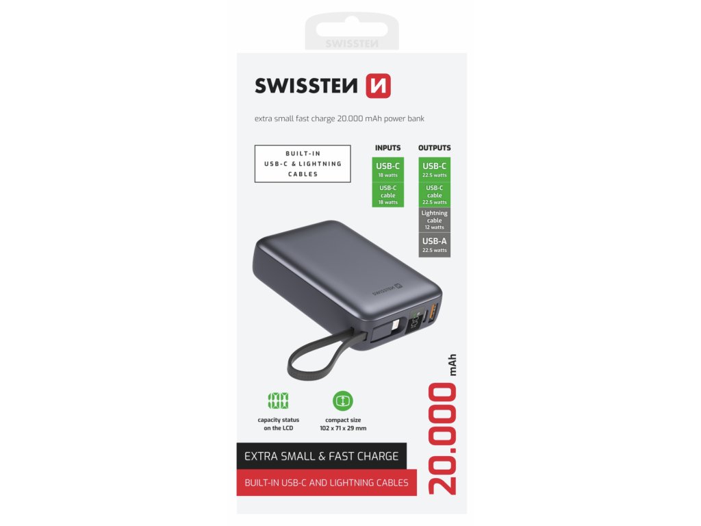 Potřebujete výkonnou a všestrannou powerbanku, která zvládne nabíjet více zařízení současně a eliminuje nutnost nosit další kabely? SWISSTEN POWER BANK 20,000 mAh ve vesmírně stříbrném provedení je skvělou volbou pro každodenní použití i delší cesty. Díky integrovaným kabelům USB-C a Lightning nabízí maximální pohodlí a spolehlivost.