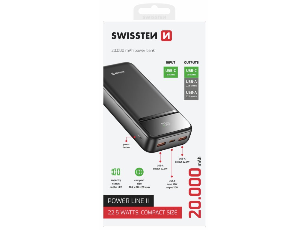 Hledáte kvalitní powerbanku, díky které již nebudete muset řešit problémy s nedostatkem energie pro Vaše zařízení? Našli jste správně! Power banka SWISSTEN s kapacitou 20.000 mAh, která vás nenechá bez energie ani na cestách. Její kompaktní design a LED displej pro snadnou kontrolu stavu baterie z ní dělají praktického společníka pro každodenní používání. Navíc nabízí široké možnosti nabíjení díky více výstupům a rychlému nabíjení.
