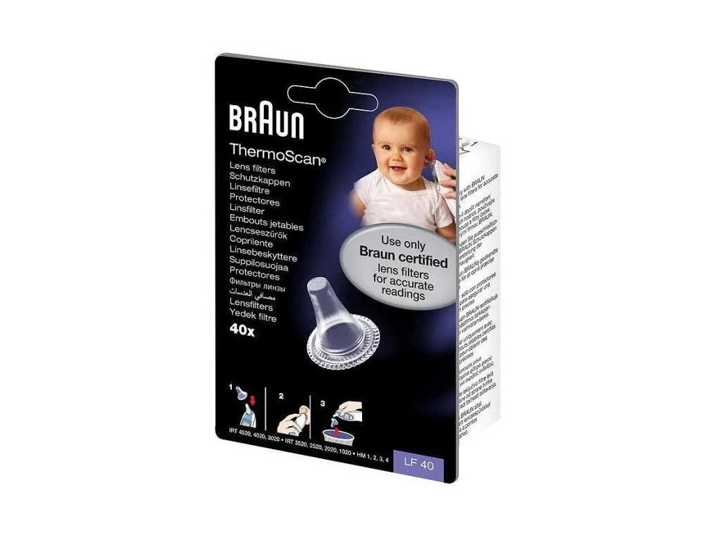 Náhradní krytky pro ušní teploměry Braun ThermoScan LF 40 bez latexu a BPA. Doplňkové příslušenství Braun obsahuje celkem 40 jednorázových náhradních krytek k hygienickému použití měření teploty. Krytky jsou kompatibilní s řadou teploměrů Braun ThermoScan 5 IRT 6020 a ThermoScan 7 IRT 6520.