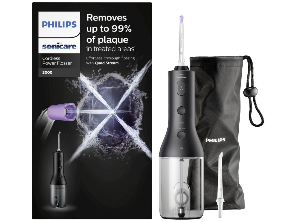 S novou ústní sprchou Philips Sonicare Cordless Power Flosser 3000 budete mít zdravé zuby a dásně bez námahy. Čištění mezizubní nití nebo mezizubními kartáčky bývá pracné, zdlouhavé a mnohdy nepříjemné. S ústní sprchou Philips Sonicare vyčistíte mezizubní prostory snadno a efektivně. Nic Vám nebude bránit v pravidelné péči. Používání Philips Sonicare Power Flosser jako doplňku k manuálnímu čištění zubů ukázalo největší míru snížení zánětu dásní, krvácení a zubního plaku, následovalo manuální čištění zubním kartáčkem plus mezizubním kartáčkem a samostatné čištění manuálním zubním kartáčkem, a to jak po 2, tak i po 4 týdnech. Srovnání mezi výrobky poskytlo statisticky významné rozdíly mezi Philips Sonicare Power Flosser, mezizubním kartáčkem a samotným manuálním zubním kartáčkem a to u všech ukazatelů a v obou časových bodech. Všechny zkoumané výrobky byly bezpečné pro použití.