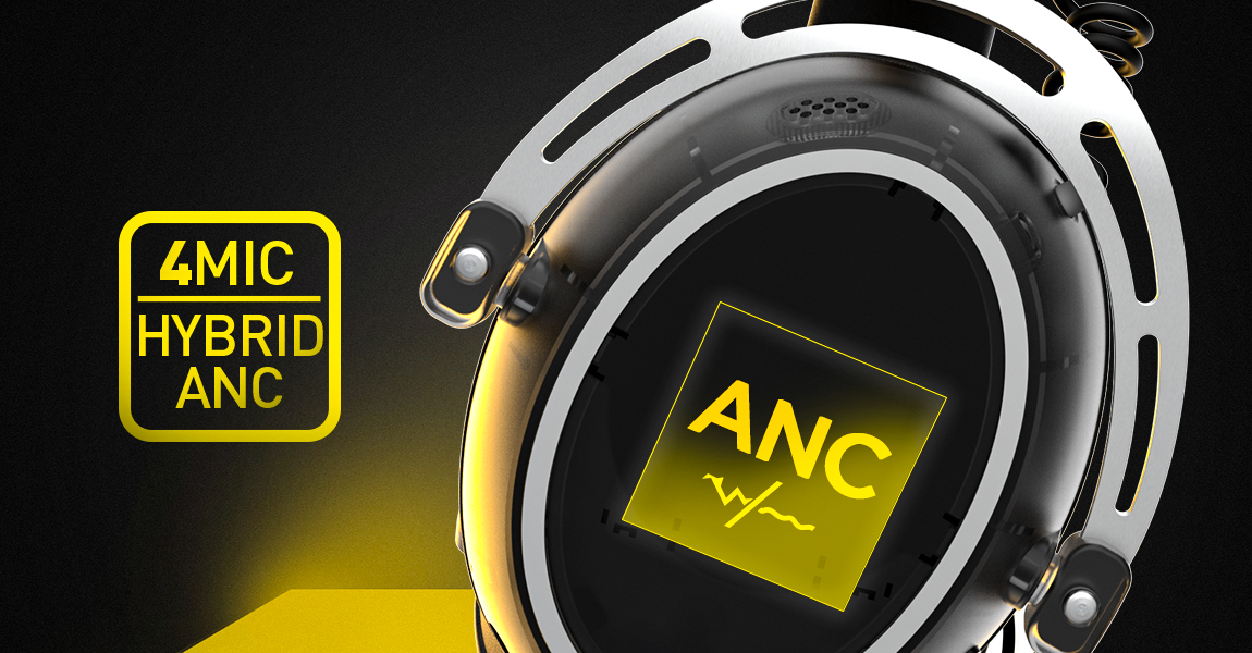 Hybridní ANC systém využívá kombinaci čtyř mikrofonů a dedikovaného procesoru k efektivnímu potlačení okolního hluku. Tato technologie zajišťuje nerušený poslech i v hlučném prostředí, což je ideální pro hraní her nebo poslech hudby.