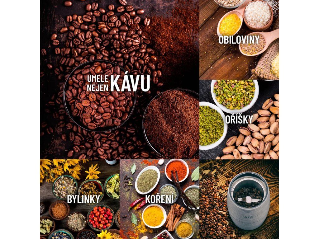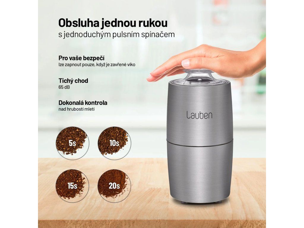 S kávovými zrny si mlýnek Lauben poradí s přehledem, zvládne ale i bylinky, semínka nebo oříšky do vánočního cukroví. O rovnoměrný a rychlý výsledek se stará celoměděný motor o příkonu 200 W. Velkou výhodou mlýnku je možnost přesné regulace hrubosti mletí díky pulsnímu spínači. Mlýnek ovládáte stlačením pulsního spínače na víku. Stupeň namletí tak určujete sami délkou celého procesu. Průběh mletí surovin můžete snadno sledovat skrz průhledné víko mlýnku.