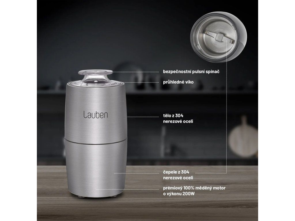 Dokonale namletá káva, ořechy nebo kořeníLauben Grinder 200ST je skvělým pomocníkem pro všechny milovníky kvalitní kávy. Mlýnek je vybavený silným celoměděným motorem, který pracuje při příkonu 200 W a má delší životnost. S tímto mlýnkem si v mžiku poradíte až s 50 g kávových zrn, ale i ořechů, semínek nebo bylinek. Sekací nůž tříštivého typu z nerezové oceli #304 se postará o rovnoměrné mletí surovin. Mlýnek se ovládá stlačením pulsního spínače na víku, hrubost namletí surovin tak můžete snadno regulovat. Pro hrubě namletou kávu nebo oříšky stačí kratší doba mletí, pro dokonale jemnou kávu nechte mlýnek pracovat delší dobu. Průběh mletí budete mít celou dobu pod kontrolou díky průhlednému víku. Tělo mlýnku i mlecí nádoba jsou vyrobeny z #304 nerezové oceli, která uchová jedinečné aroma čerstvě namleté kávy po celou dobu přípravy. Za nezaměnitelnou vůní už nemusíte ráno spěchat do oblíbené kavárny. Mlýnek se ovládá velmi snadno jednou rukou a k uvedení do provozu stačí zavření a stlačení víka. Tento způsob obsluhy je zároveň velmi bezpečný, protože mlýnek se nikdy nezapne otevřený. Samozřejmostí je pojistka proti přehřátí. Potěší vás jistě i velmi tichý chod a elegantní minimalistické provedení, které z mlýnku udělá designový doplněk každé kuchyně.